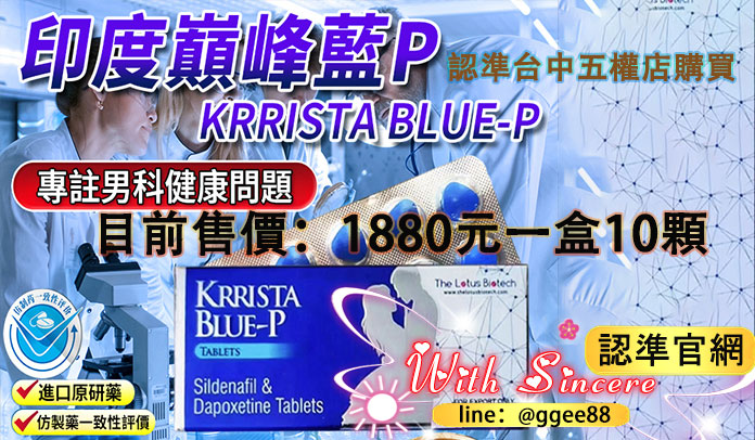 正品 印度巔峰藍P(KRRISTA BLUE-P) 由 印度 Ether Pharma Pvt. Ltd. 原廠生產,所有包裝必須清楚標示 公司全名 及 GMP 認證編號,以確保製程符合國際藥品品質標準。