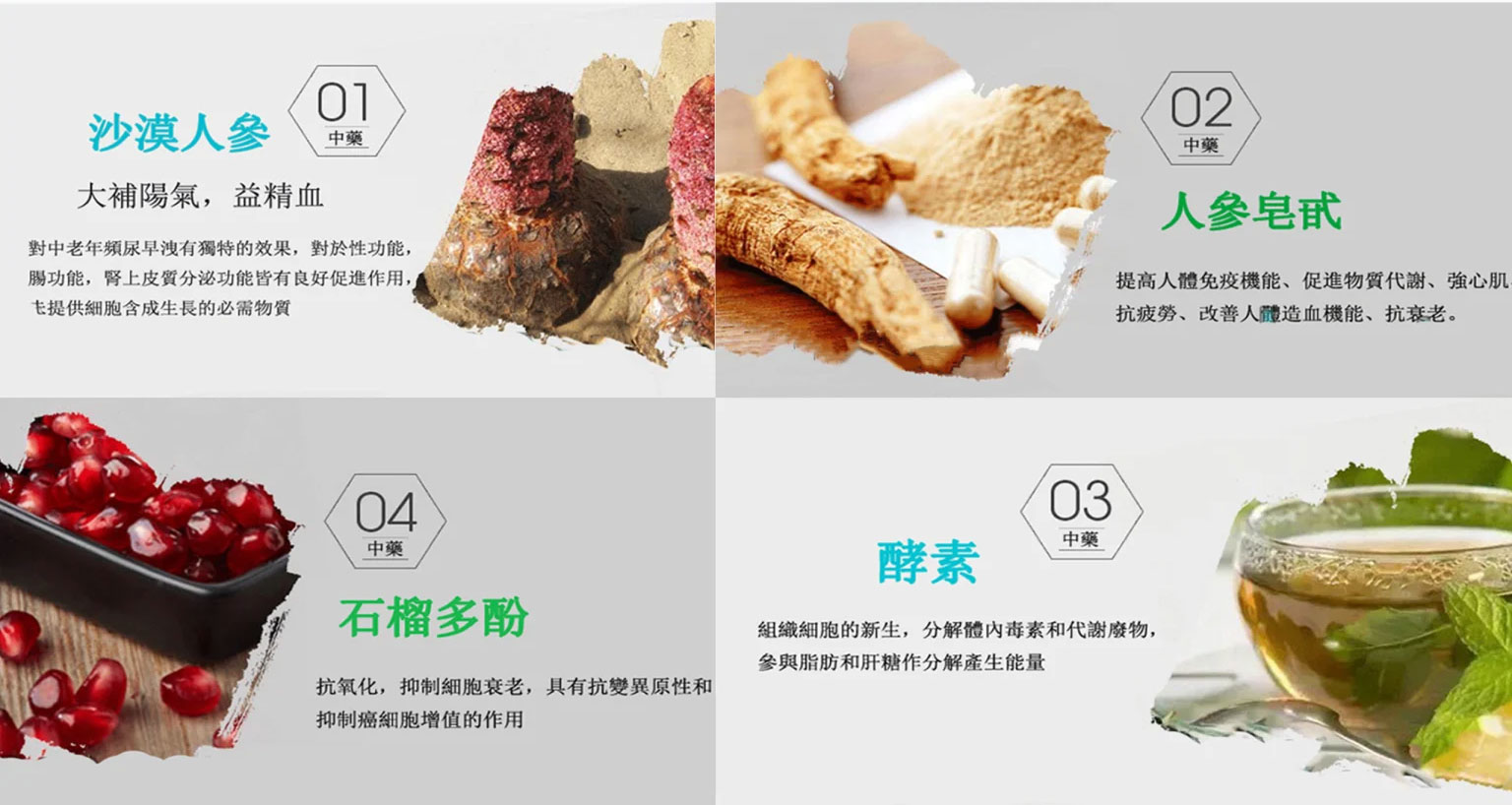 - 成分:沙漠人參、鎖陽、石榴多酚、人參皂苷、水果酵素