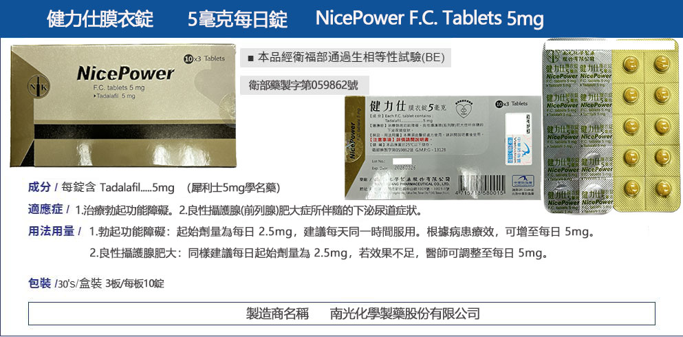 • 商品名稱:健力仕膜衣錠 NicePower 5mg