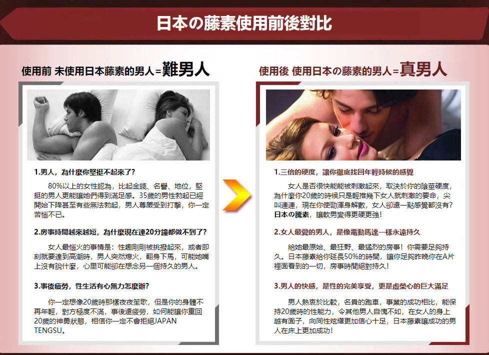 日本藤素是唯一的一種100%純天然,安全,有效的男性功能藥物,它可以解決男人性生活中的尷尬難題。隻有日本藤素可以帶給男性朋友更多的男性魅力,性能力,和性是快感,而且完全沒有任何健康風險,並且不需要醫生處方。這是因為日本藤素結合了天然成分和被臨床證明有效的濃度值,從而最大程度提高了您的性慾和性能力。